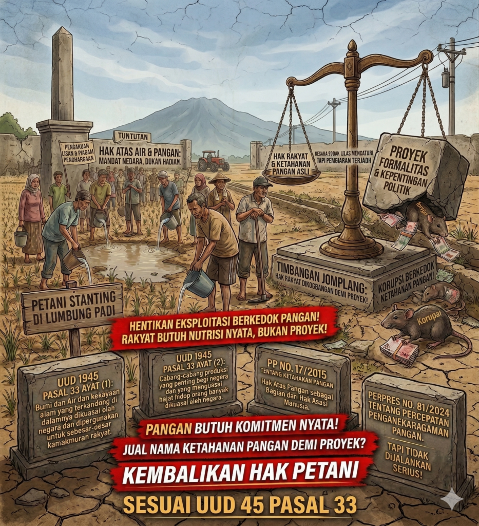 “Negara harus diingatkan kembali pada Pasal 33 Ayat (3) UUD 1945 yang menyatakan: ‘Bumi dan air dan kekayaan alam yang terkandung di dalamnya dikuasai oleh negara dan dipergunakan untuk sebesar-besar kemakmuran rakyat.’ Di Cicangkanghilir, air tidak dikelola untuk rakyat, irigasi dibiarkan hilang, dan rakyat dipaksa ‘puasa’ produktivitas. Ini adalah pelanggaran hak konstitusional petani!” tegas Kang Harry.